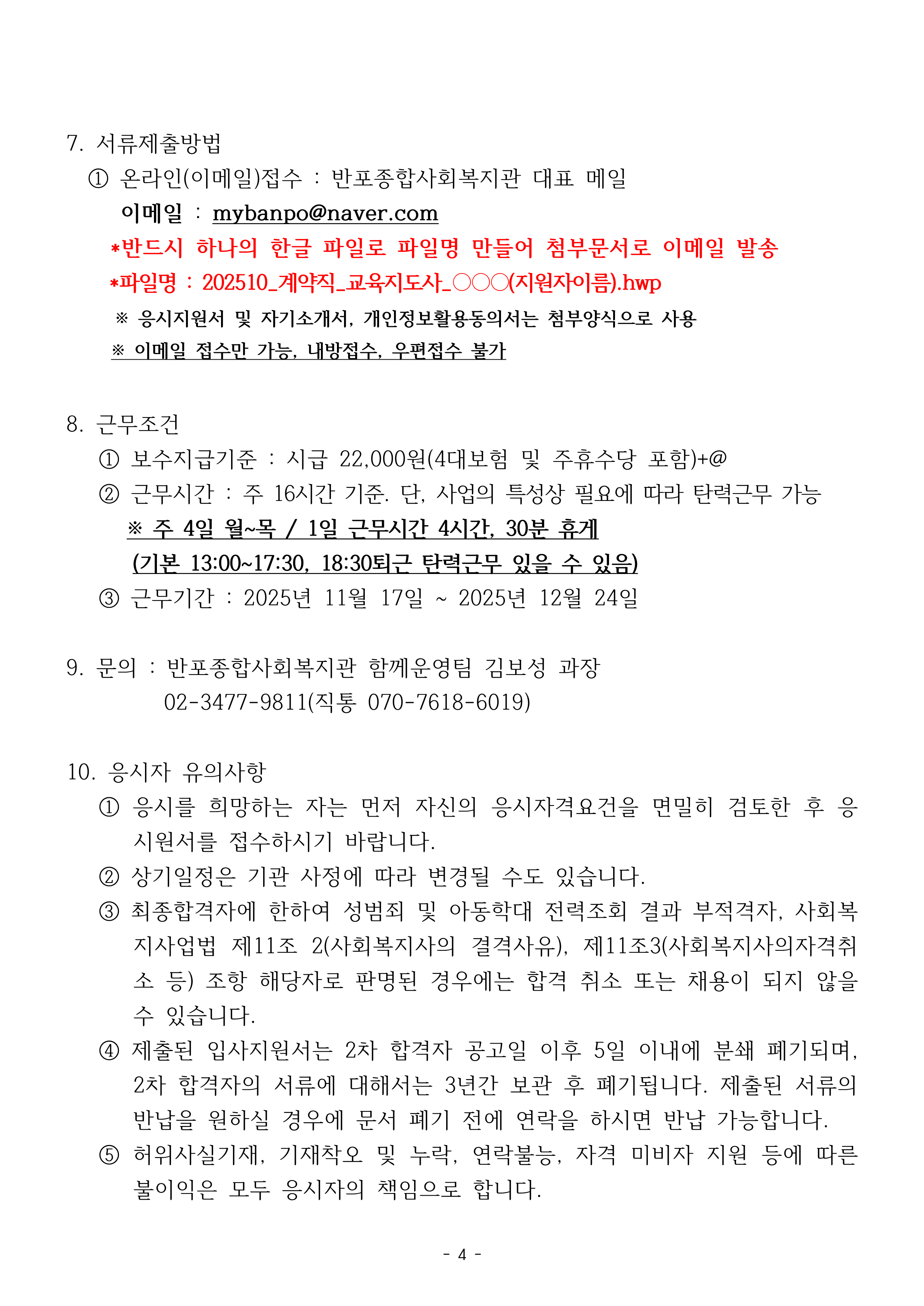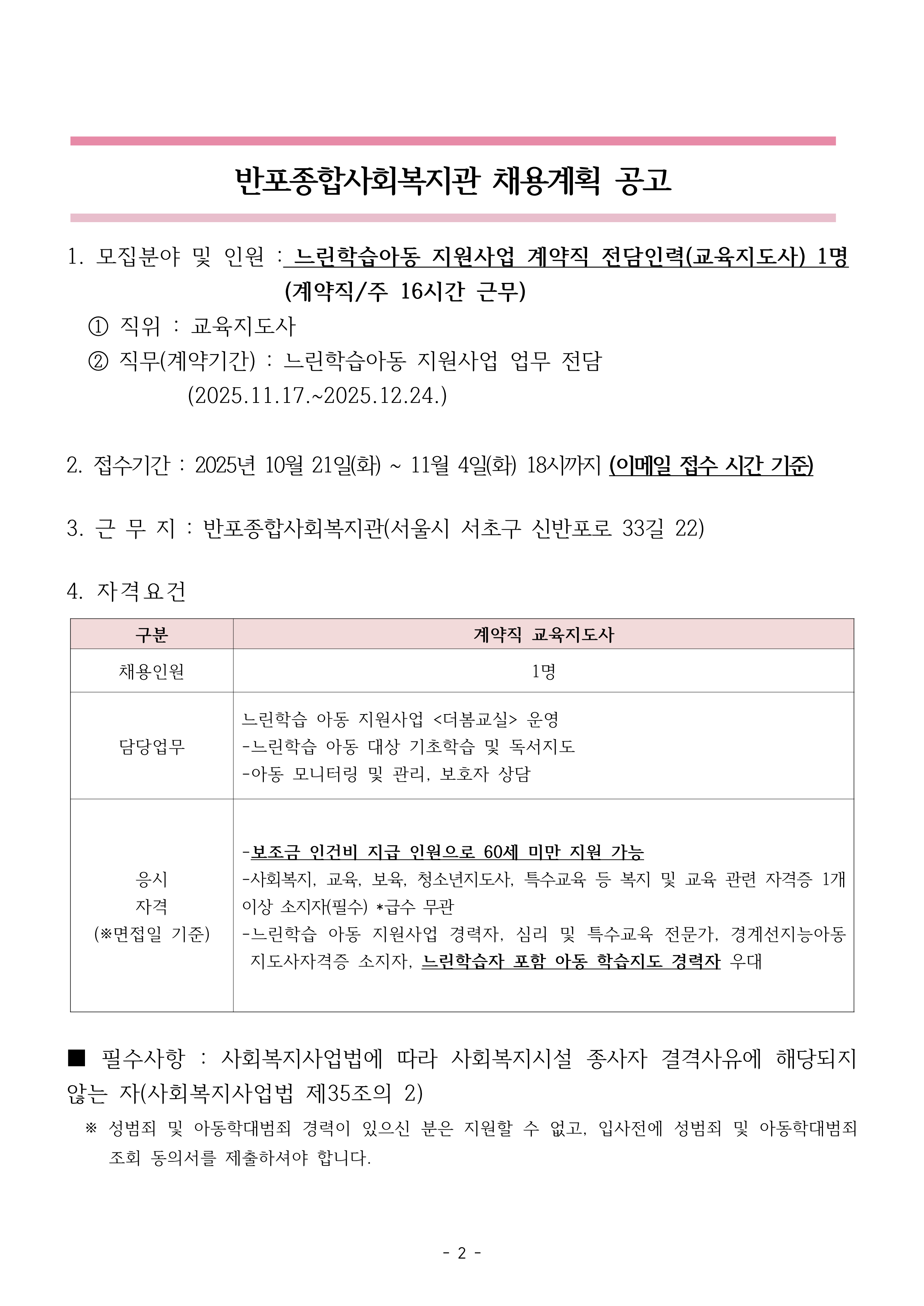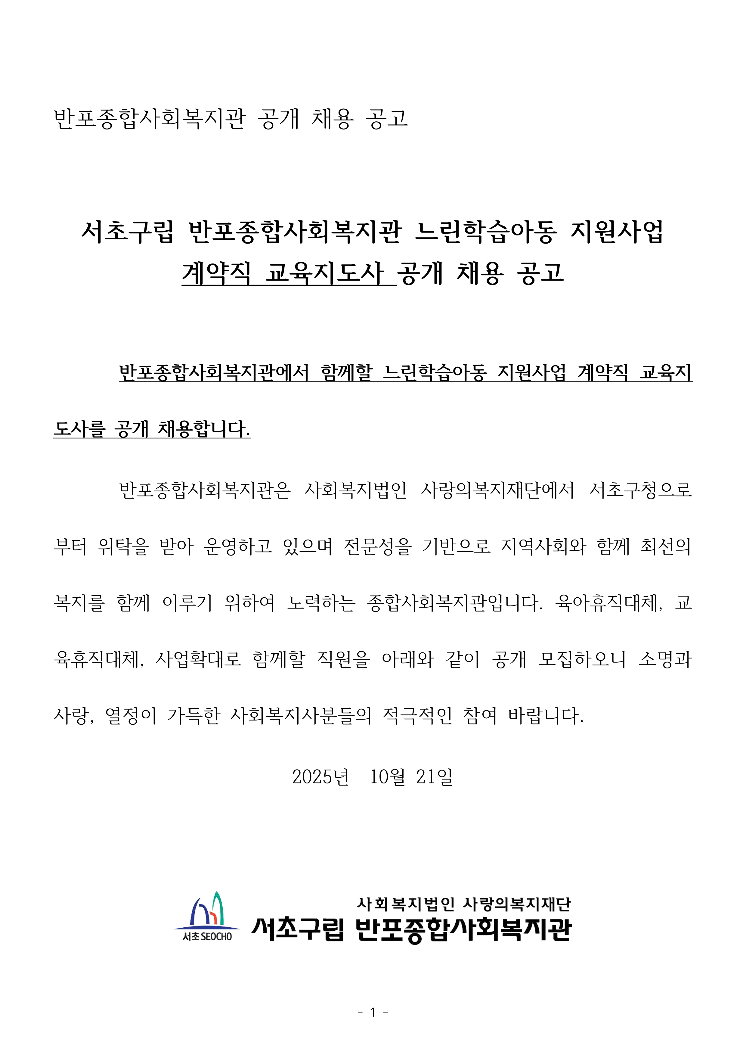 Á¦¸ñ [¹ÝÆ÷Á¾ÇÕ»çȸº¹Áö°ü] ´À¸°ÇнÀ¾Æµ¿ Áö¿ø»ç¾÷ °è¾àÁ÷ ±³À°Áöµµ»ç °ø°³ ä¿ë °ø°í