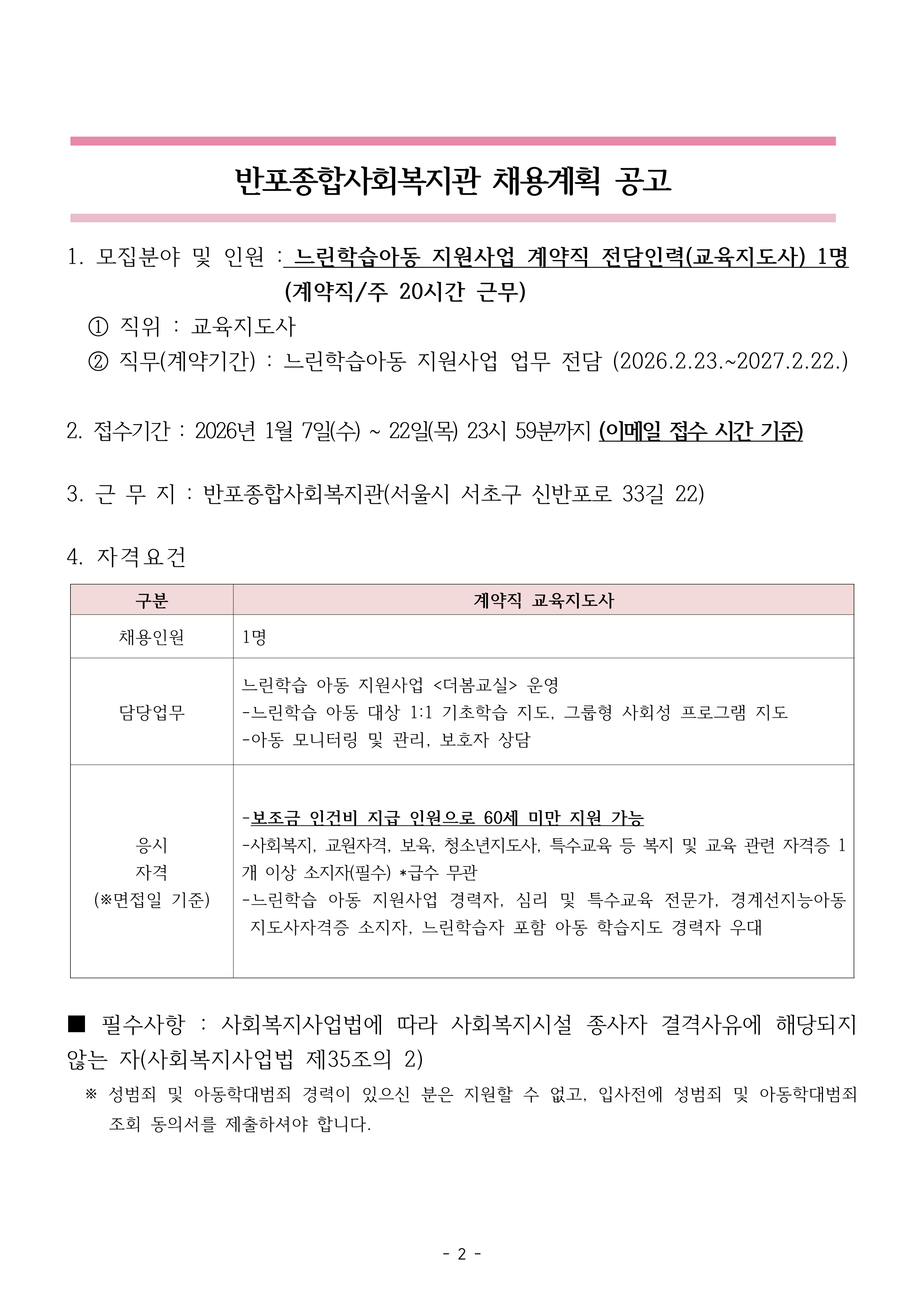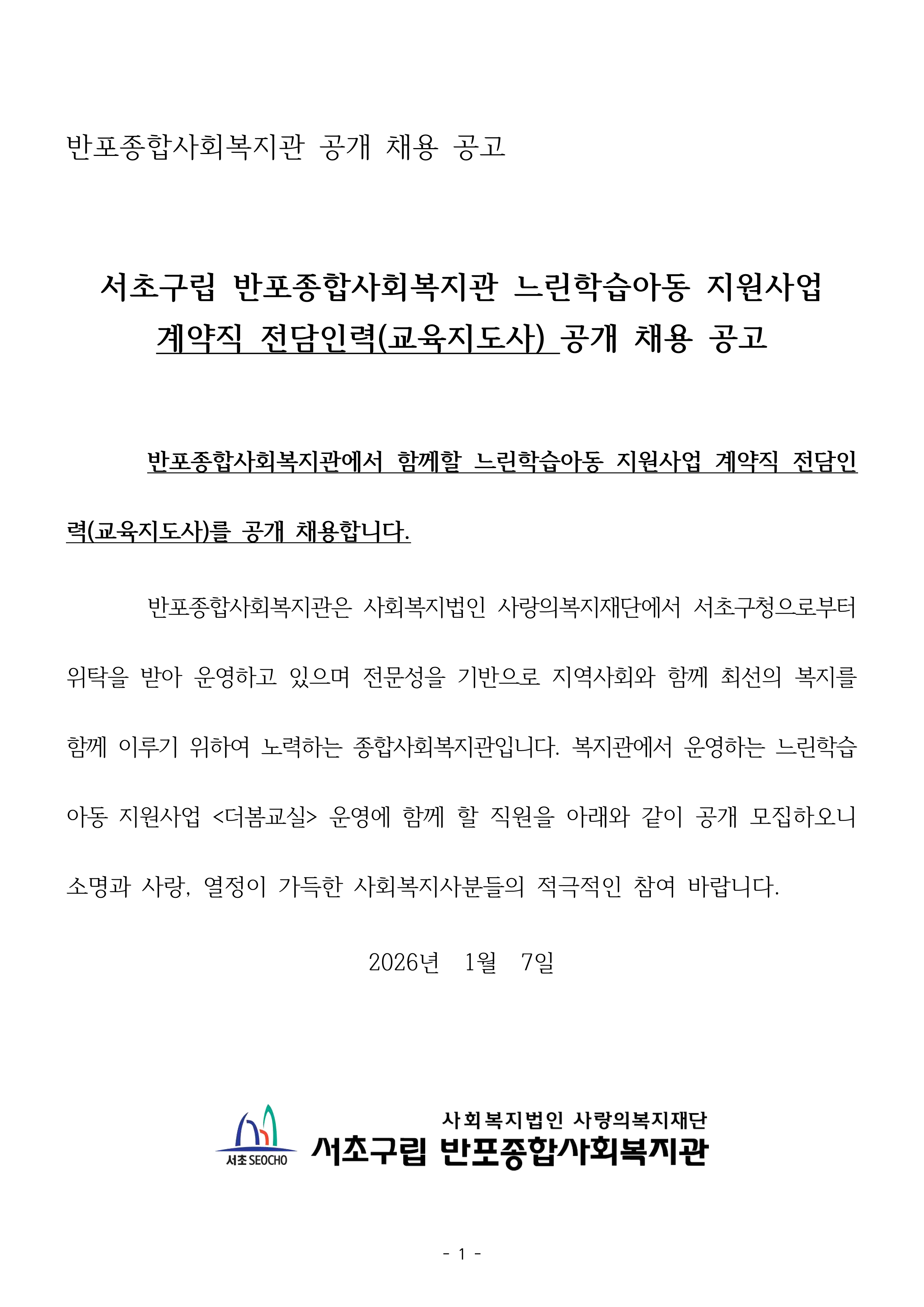 Á¦¸ñ [¹ÝÆ÷Á¾ÇÕ»çȸº¹Áö°ü] ´À¸°ÇнÀ¾Æµ¿ Áö¿ø»ç¾÷ °è¾àÁ÷ Àü´ãÀηÂ(±³À°Áöµµ»ç) °ø°³ ä¿ë °ø°í